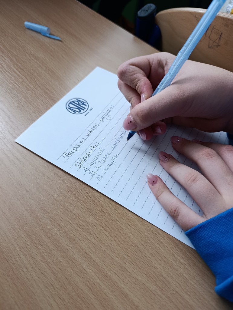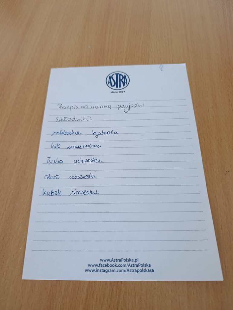 Po części teoretycznej przyszedł czas na część praktyczną, w której zadaniem uczniów kl. VIII B było stworzyć przepis i podać składniki na idealną przyjaźń. Podczas tego zadania uczniowie naszej szkoły wykazali się dużą wrażliwością, ale też kreatywnością i poczuciem humoru.