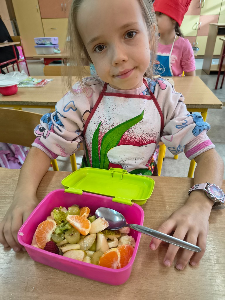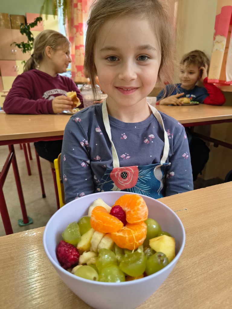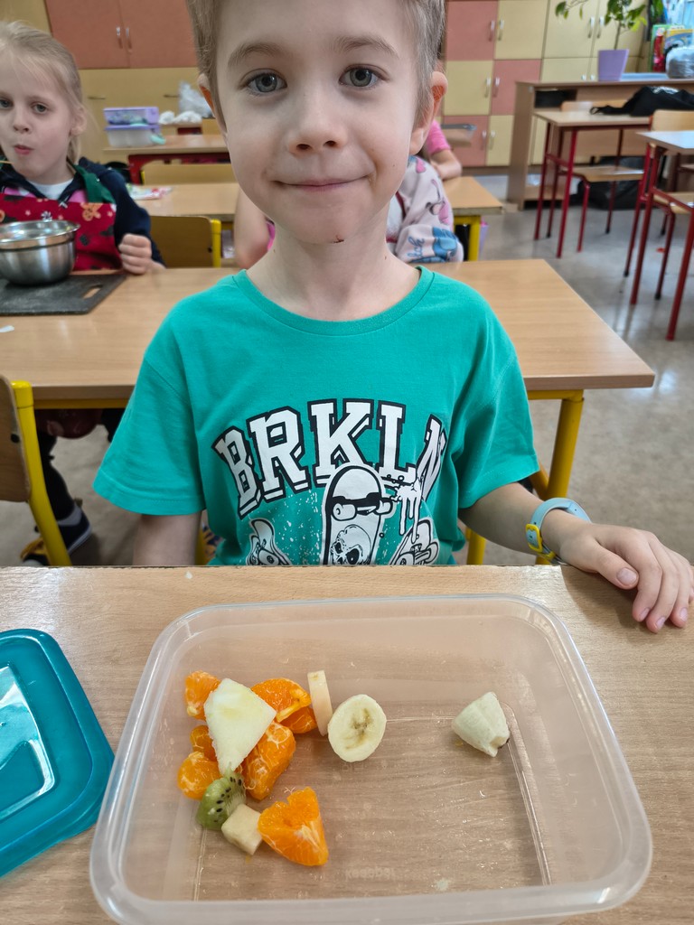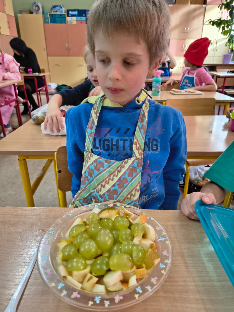 W ramach realizacji bloku tematycznego o zdrowiu, uczniowie klasy 1a przygotowywali zdrowe posiłki. Dzieci miały do wyboru "zdrową kanapkę" lub "owocową sałatkę". Wszyscy bardzo chętnie i z ogromnym zapałem zaangażowali się w przygotowanie smakołyków. Poza poznawaniem walorów odżywczych poszczególnych składników i ich znaczenia dla zdrowia, ważne było nabywanie i kształtowanie innych umiejętności jak organizacja stanowiska pracy, higiena przygotowywania i spożywania posiłków, posługiwanie się przyborami kuchennymi i samodzielność. Dla uczniów klasy 1 była to wyjątkowa i dobra "zabawa". Dzieci spisały się na medal i doskonale poradziły sobie z wszystkimi czynnościami, a najlepszą nagrodą było spożycie przygotowanych pyszności.