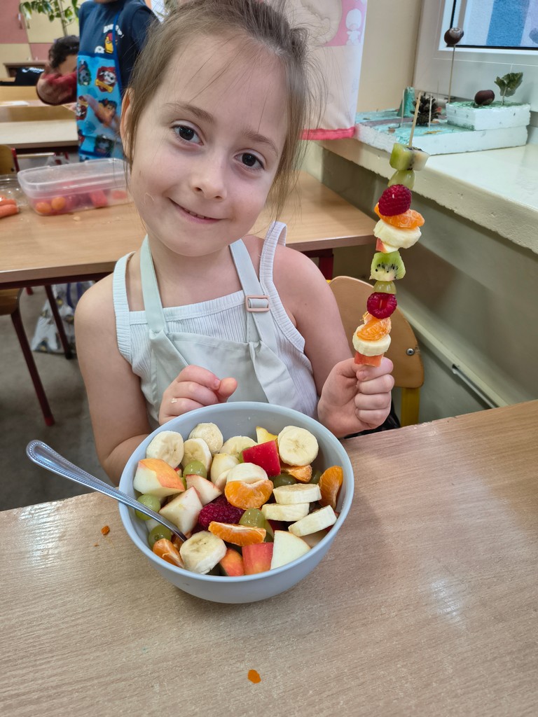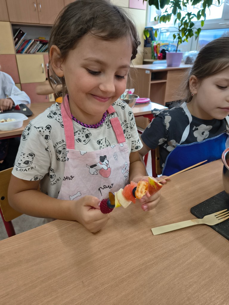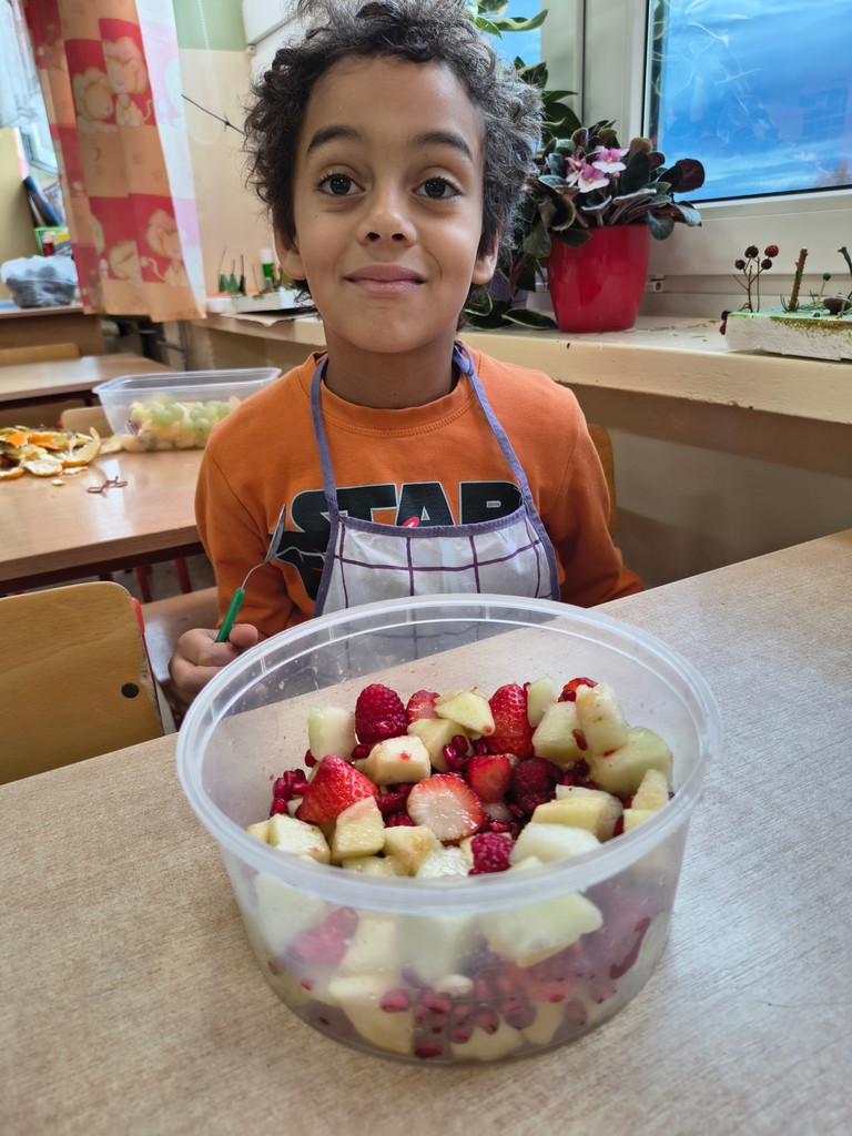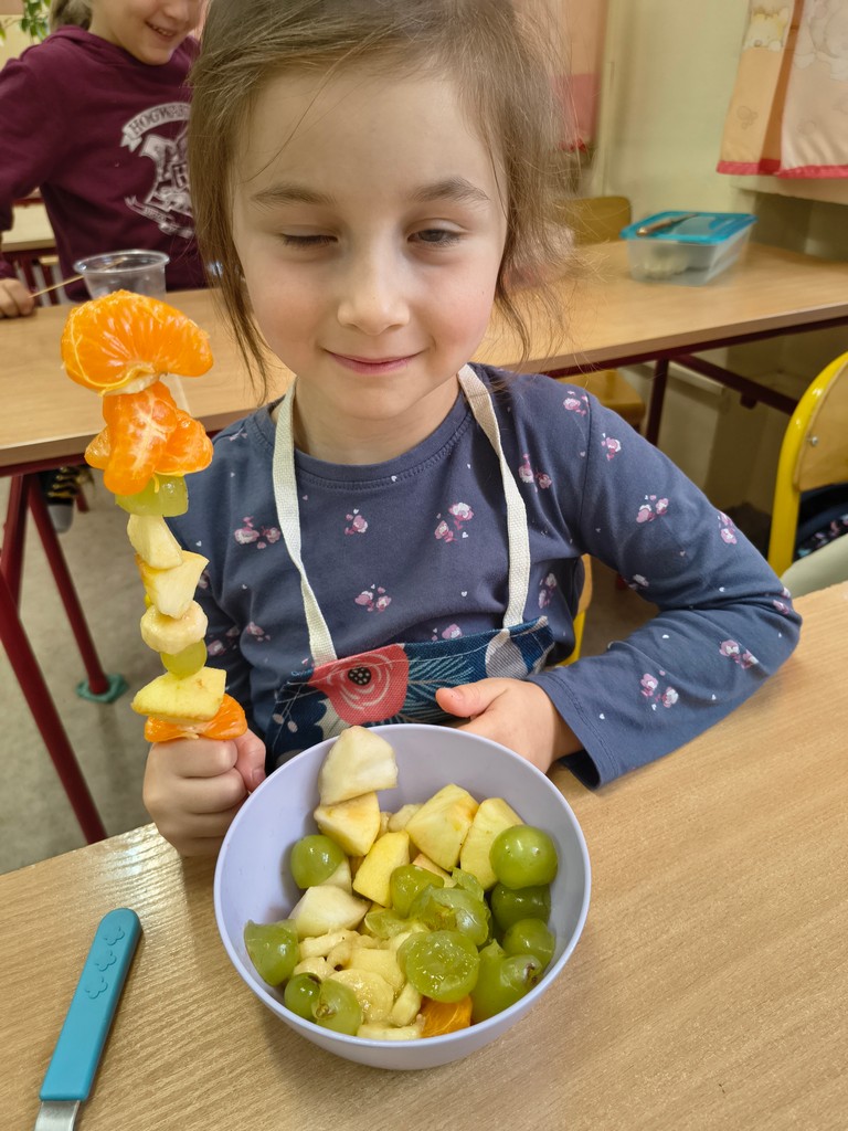 W ramach realizacji bloku tematycznego o zdrowiu, uczniowie klasy 1a przygotowywali zdrowe posiłki. Dzieci miały do wyboru "zdrową kanapkę" lub "owocową sałatkę". Wszyscy bardzo chętnie i z ogromnym zapałem zaangażowali się w przygotowanie smakołyków. Poza poznawaniem walorów odżywczych poszczególnych składników i ich znaczenia dla zdrowia, ważne było nabywanie i kształtowanie innych umiejętności jak organizacja stanowiska pracy, higiena przygotowywania i spożywania posiłków, posługiwanie się przyborami kuchennymi i samodzielność. Dla uczniów klasy 1 była to wyjątkowa i dobra "zabawa". Dzieci spisały się na medal i doskonale poradziły sobie z wszystkimi czynnościami, a najlepszą nagrodą było spożycie przygotowanych pyszności.