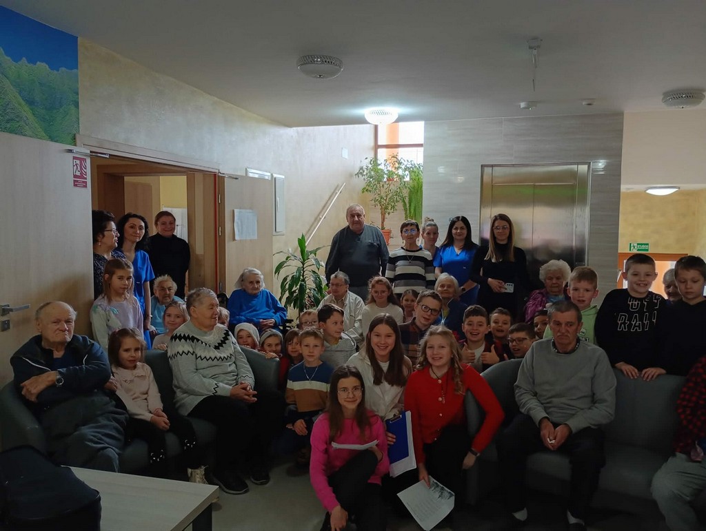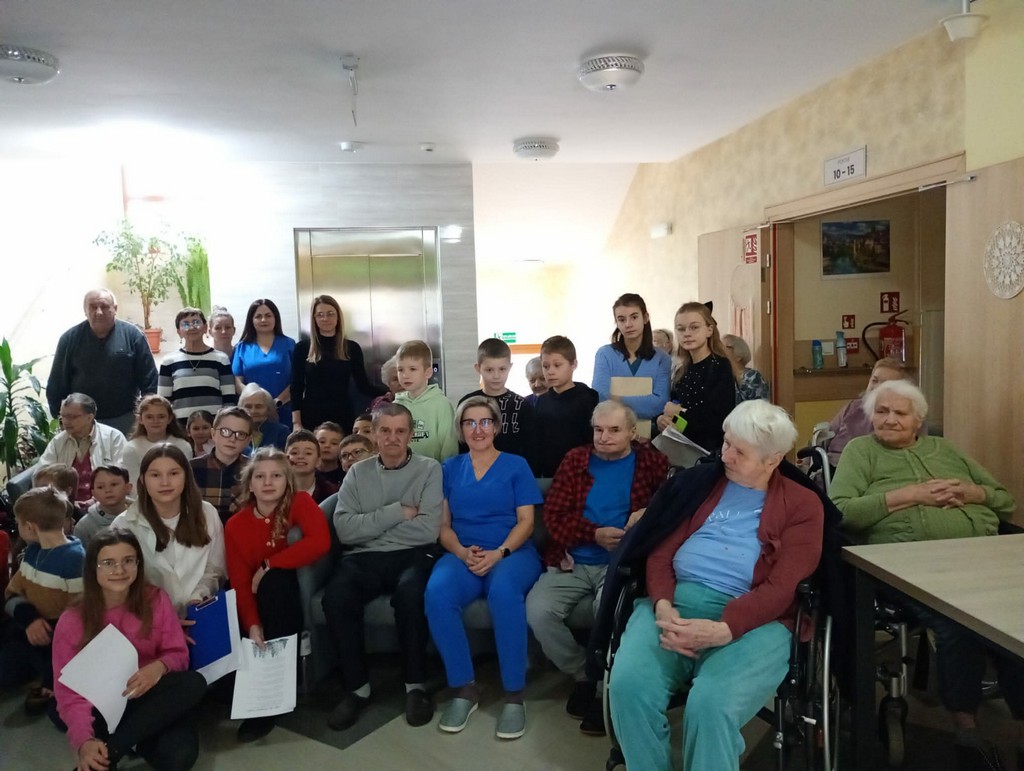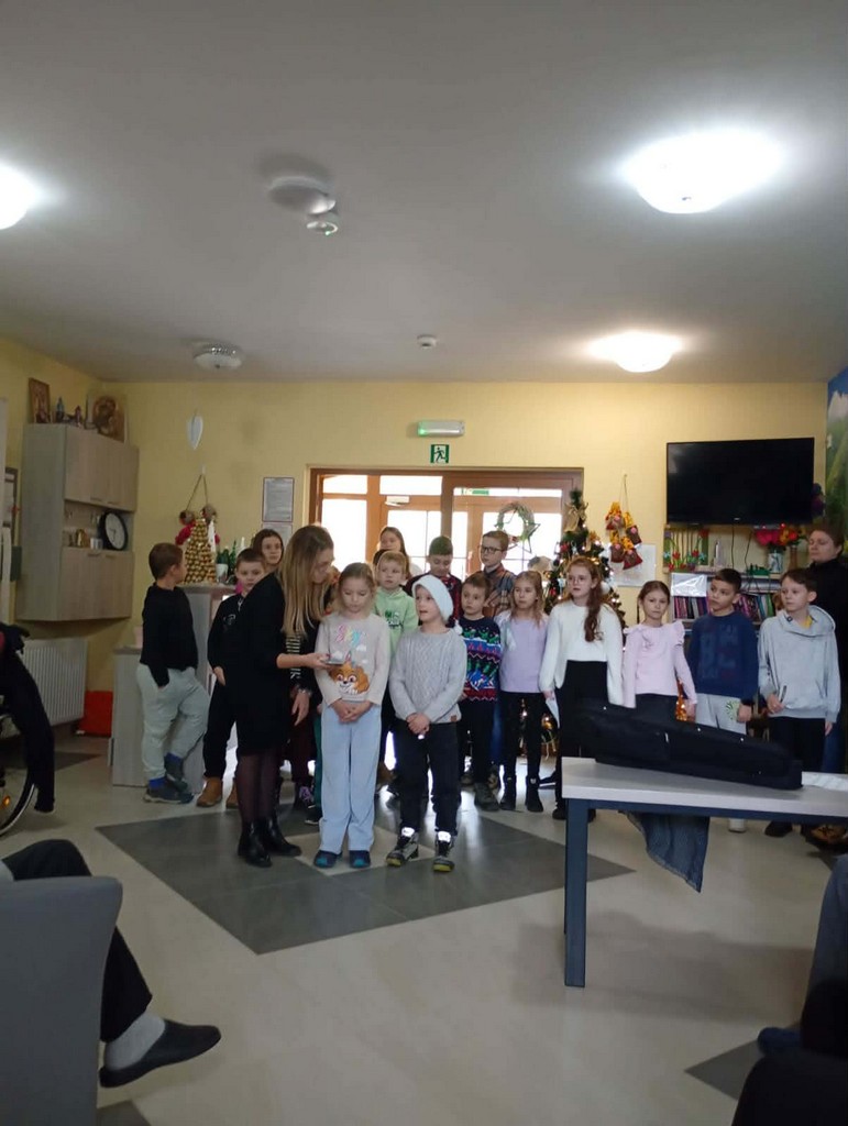 Mamy przyjemność przedstawić Wam małą grupę wolontariacką, Małe serduszka. Klasy 5 b oraz 2a z opiekunami Joanną Moroń i Justyną Burkot przygotowały dary pełne miłości dla seniorów przebywających w Domu Pomocy Społecznej w Wapiennym. Uczniowie zebrali produkty spożywcze oraz kosmetyczne, które umilą pobyt poznanym babciom i dziadkom oraz przygotowali mini koncert kolęd. Były łzy wzruszenia oraz radość z poznania nowych osób. Bardzo się cieszymy że wizyty w Wapiennym na stałe zagościły w kalendarzu tych klas.