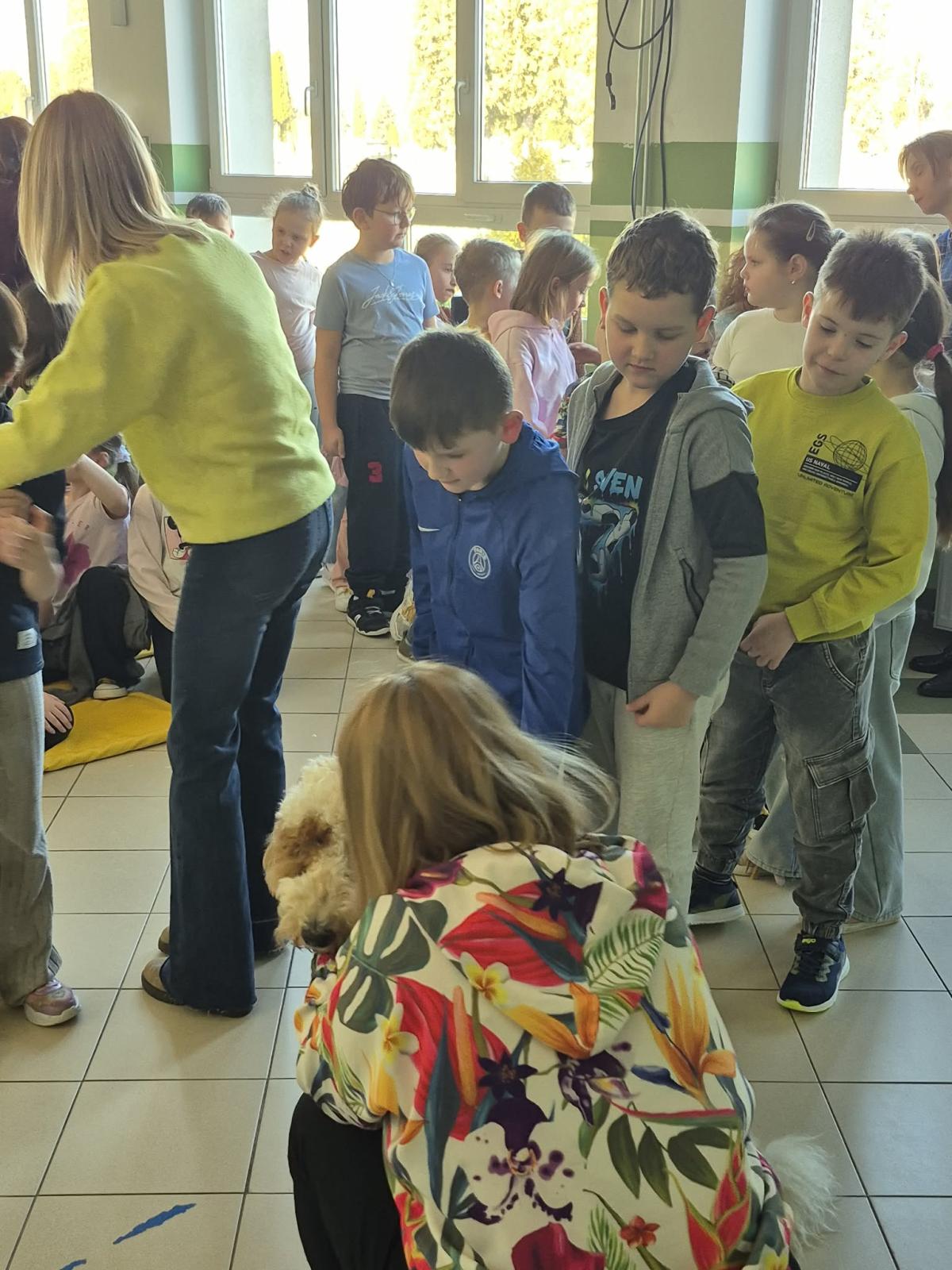 Dużą atrakcją spotkania była obecność psa Lokiego, który przyszedł razem z wolontariuszką. Dzieci mogły go pogłaskać i z bliska zobaczyć, jak wygląda kontakt z odpowiednio ułożonym i zadbanym pupilem. Spotkanie z Lokim sprawiło uczniom wiele radości i było dla nich cennym doświadczeniem.