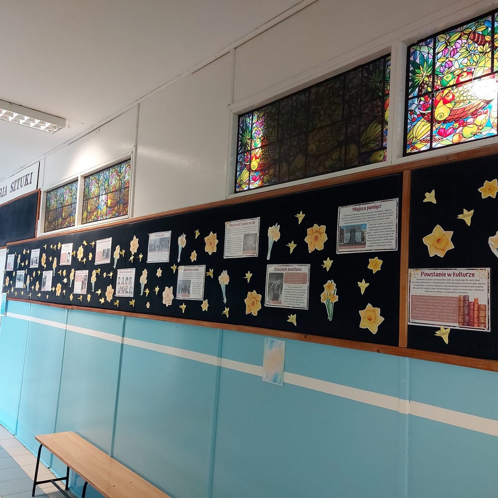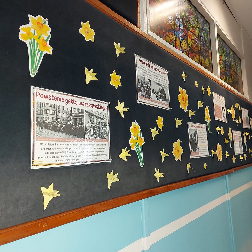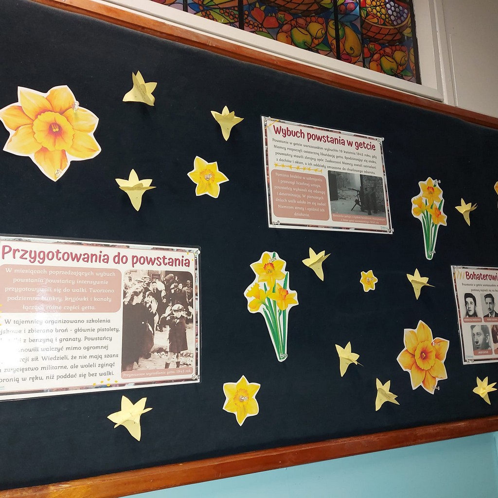 Dodatkowo na drugim piętrze szkoły została przygotowana gazetka tematyczna. Można na niej znaleźć informacje o wydarzeniach z 19 kwietnia 1943 roku oraz prace uczniów, które skłaniają do refleksji i przypominają o ważnych momentach historii.