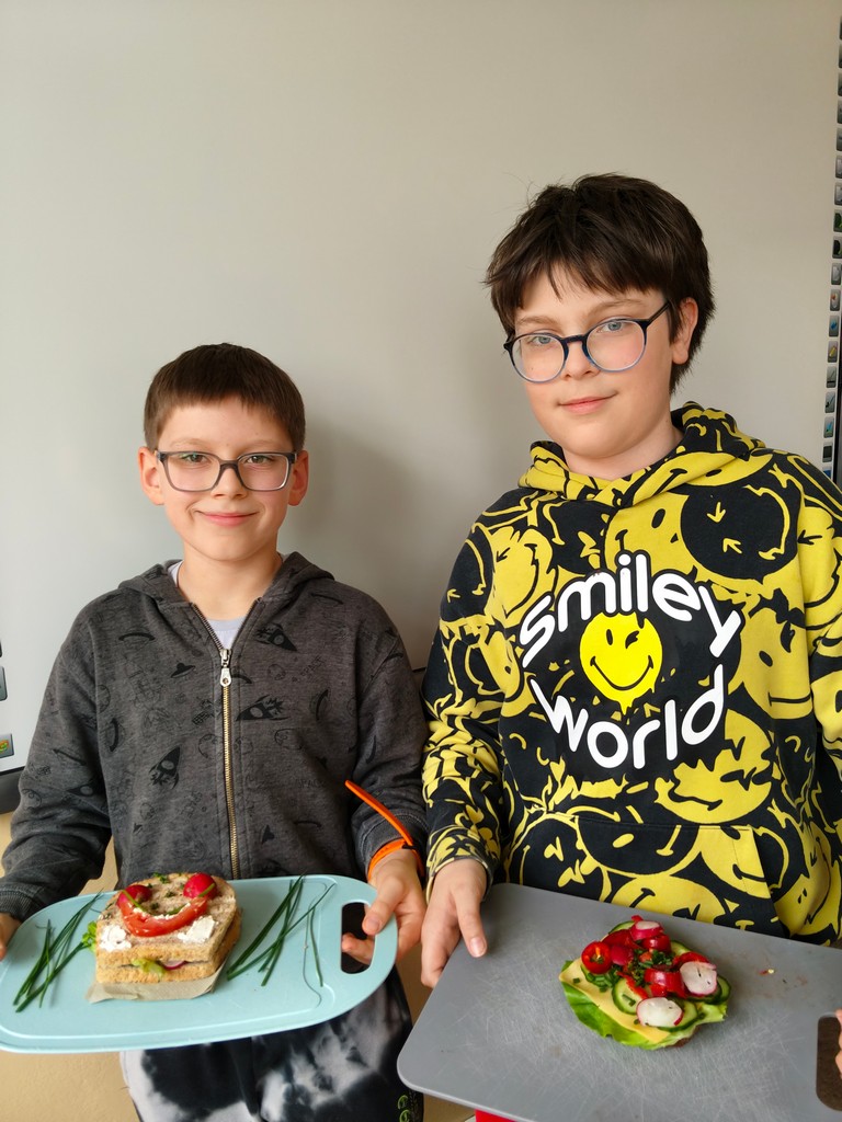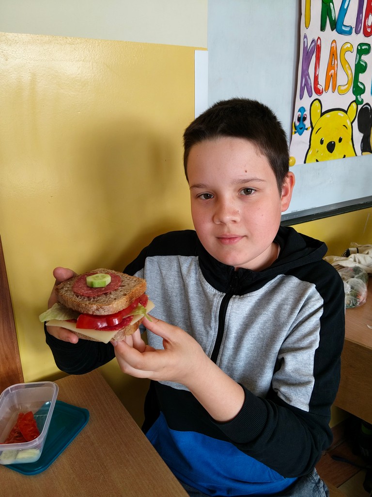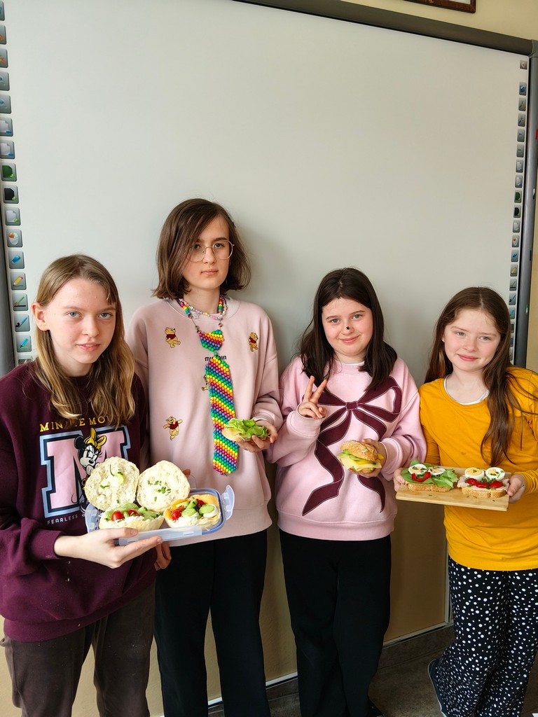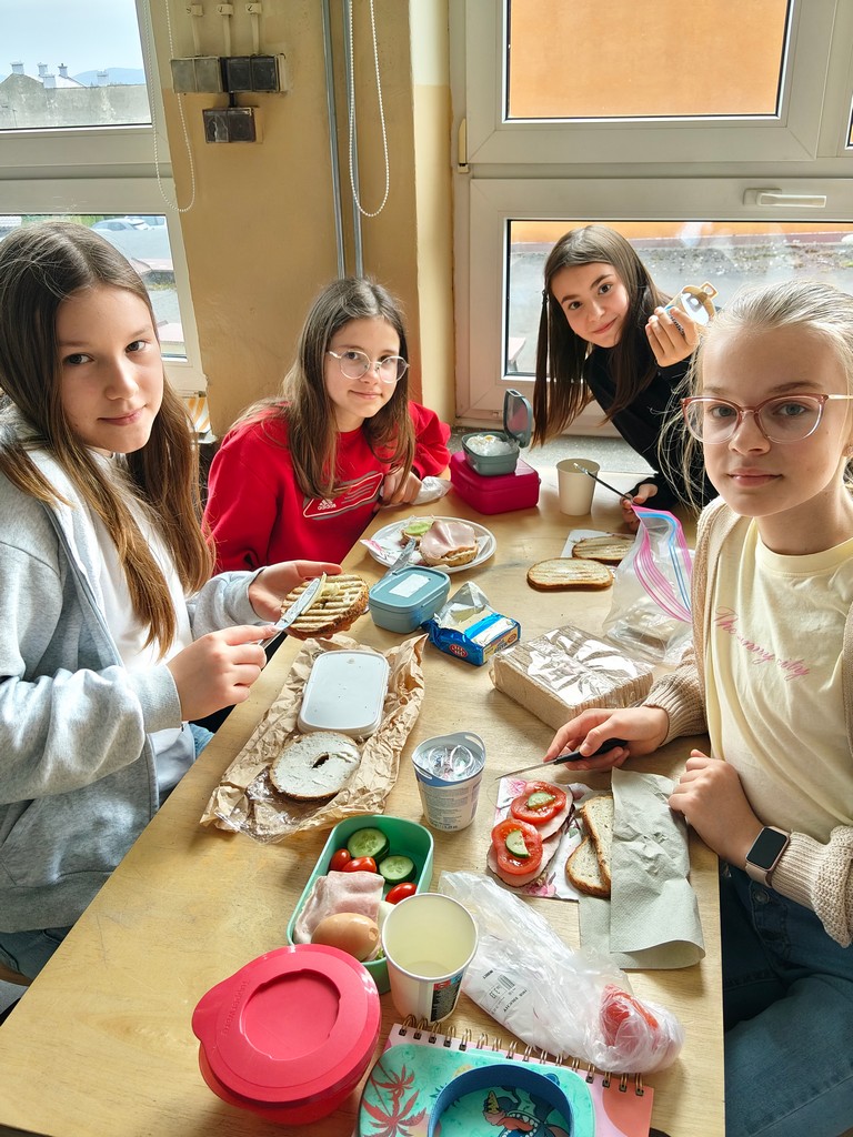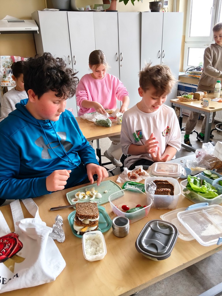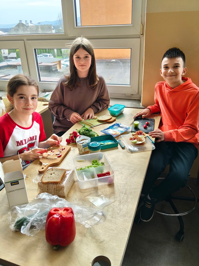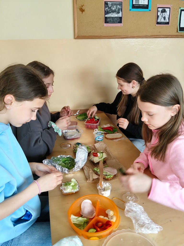 Dużym zainteresowaniem cieszył się także „Dzień Lemoniady” – uczniowie ubrani w żółte i pomarańczowe stroje rozświetlili szkolne korytarze.  Uczniowie klas piątych i szóstych w ramach Tygodnia Profilaktyki Zdrowotnej uczestniczyli w wyjątkowej lekcji techniki, podczas której przygotowywali zdrowe kanapki. Celem zajęć było kształtowanie prawidłowych nawyków żywieniowych oraz zwrócenie uwagi na znaczenie zdrowej diety w codziennym życiu. Podczas lekcji uczniowie samodzielnie komponowali kanapki, korzystając z wartościowych produktów, takich jak pełnoziarniste pieczywo, świeże warzywa, sery, jajka oraz chude wędliny. Zwracano uwagę na higienę pracy oraz bezpieczne korzystanie z przyborów kuchennych. Na zakończenie zajęć odbyła się wspólna degustacja, podczas której uczniowie mogli spróbować swoich wyrobów i podzielić się wrażeniami. Nie zabrakło również pomysłowości – kanapki były kolorowe, estetyczne i zachęcające do jedzenia. Zajęcia przebiegły w radosnej atmosferze, a uczniowie nie tylko dobrze się bawili, ale także zdobyli praktyczną wiedzę na temat zdrowego odżywienia.