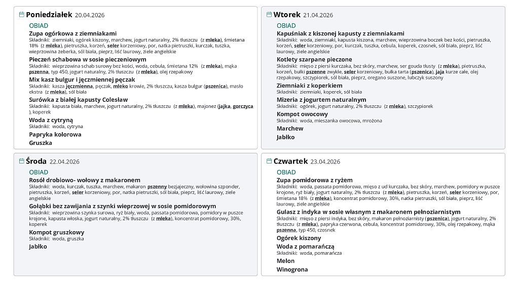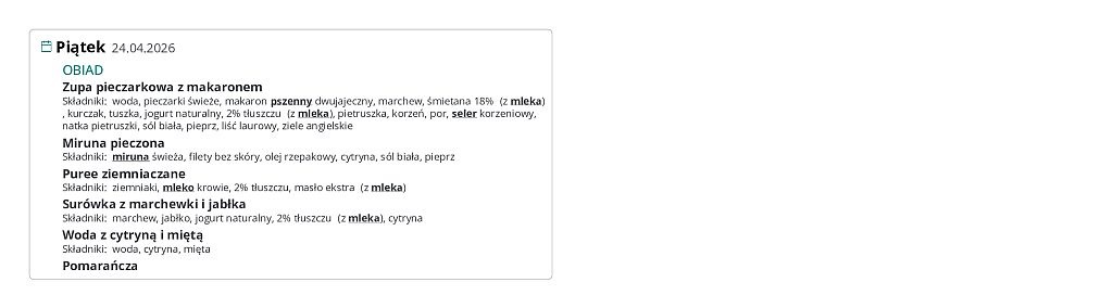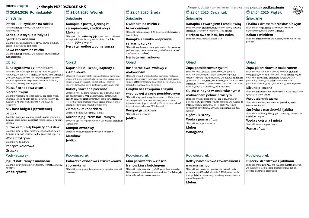 Drukuj Powrót do poprzedniej strony Jadłospis Treść Do pobrania: Jadłospis - pdf. Alergeny zostały wyróżnione na jadłospisie poprzez podkreślenie. Do pobrania: Jadłospis - pdf.